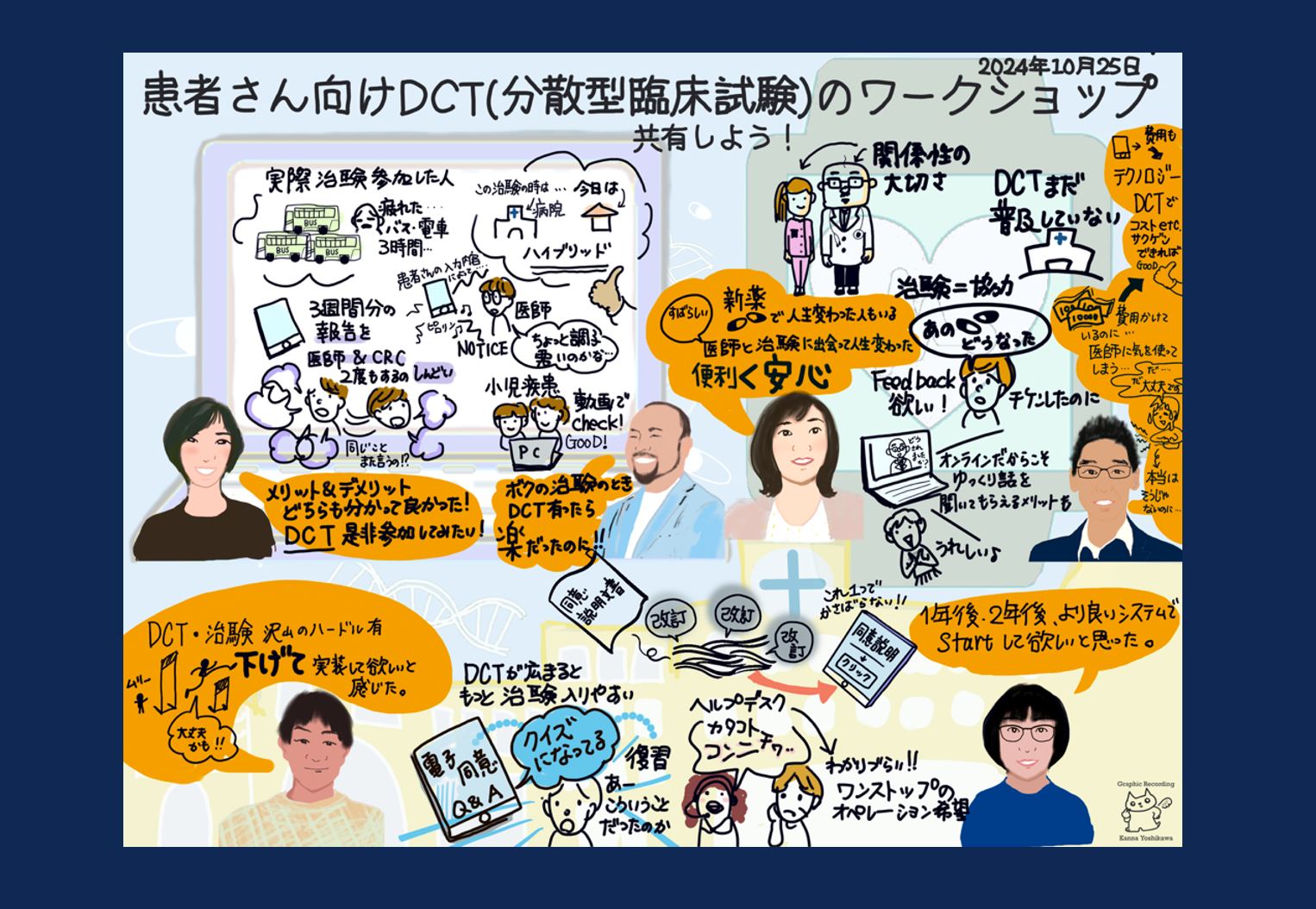 Reading Time: < 1 minutes2024年10月25日、東京都内において一般社団法人ピーペック協力のもと、イーピーエス株式会社とともに、「患者さんと一緒に考えるこれからの治験〜分散型臨床試験で変わる治験参加体験〜」をテーマとした分散型臨床試験(DCT)ワークショップを開催しました。本ワークショップは、DCTへの患者さんの想いや考えを理解しDCTが患者さんの治験体験に与える影響を理解し、より参加しやすい治験の実現につなげていくことを目的としています。6名の患者さん(うち4名が治験参加経験者)をお招きし、DCTに関する貴重な意見を伺いました。 本イベントは、「聞いてみよう!」「触れてみよう!」「話してみよう!」「共有しよう!」の4つのセッションで構成されました。それぞれのセッションで、DCTの概要を理解し、実際にDCTツールを体験し、患者さんの声を深掘りしました。… Read More