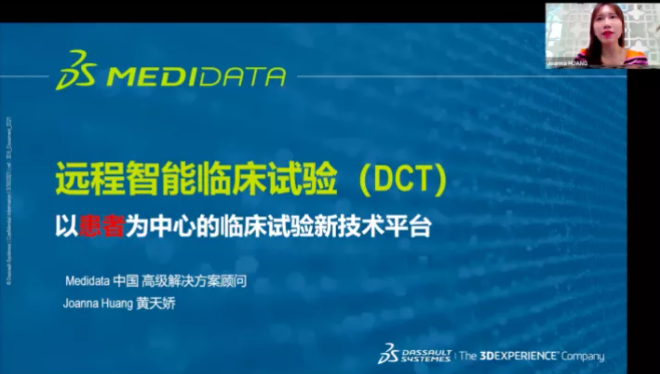 Medidata中国高级解决方案顾问黄天娇(Joanna Huang)带来《DCT远程智能临床试验—以患者为中心的临床试验新技术平台》的演讲。