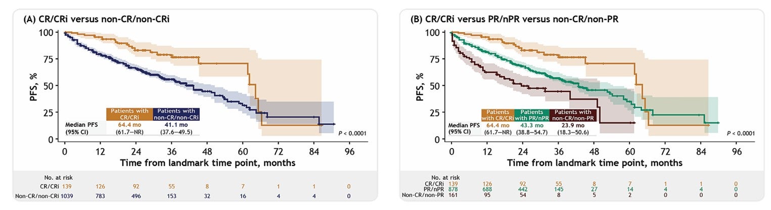 所有患者中,CR/CRi的比例为15.08%。依据Landmark分析法控制时间偏倚,Medidata对比数据证明了治疗后12个月内实现并维持CR/CRi与长期生存结果改善显著相关,调整后风险比(HR)为0.62(95%置信区间:0.42–0.90,p值=0.01)。与此同时,与仅部分缓解(PR)或完全没有缓解(nPR)的患者相比,治疗后保持CR/CRi的复发或难治性CLL/SLL患者的生存优势更明显,且优于未达到任何缓解或换届后未能维持的患者(如下图)。