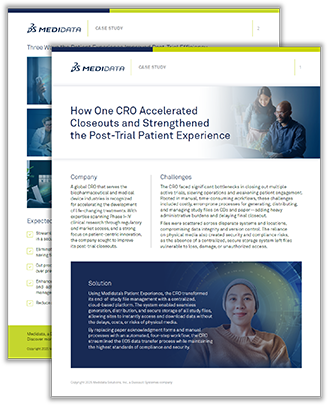 A global CRO faced significant bottlenecks in closing out multiple active trials, slowing operations and weakening patient engagement. Discover how they strengthened the post-trial process by leveraging the Medidata Patient Experience, an AI-powered suite of capabilities.