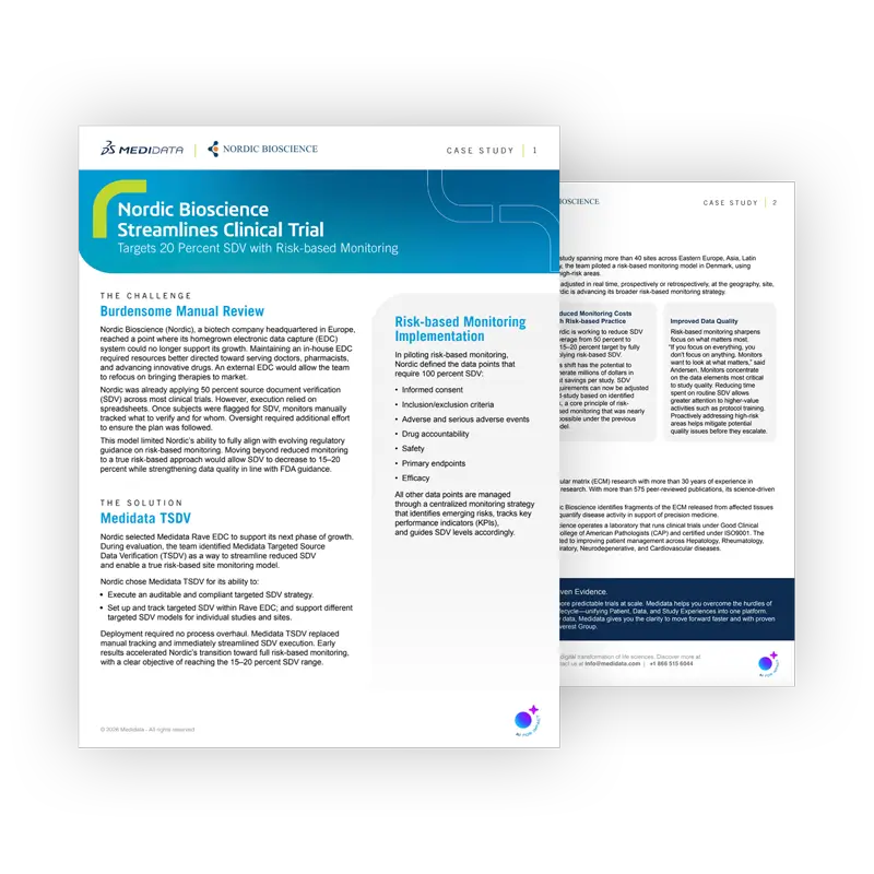 Nordic Bioscience replaced manual SDV tracking with Medidata TSDV and piloted true risk-based monitoring. The result: streamlined execution and a path toward 15–20% SDV with significant cost savings potential.