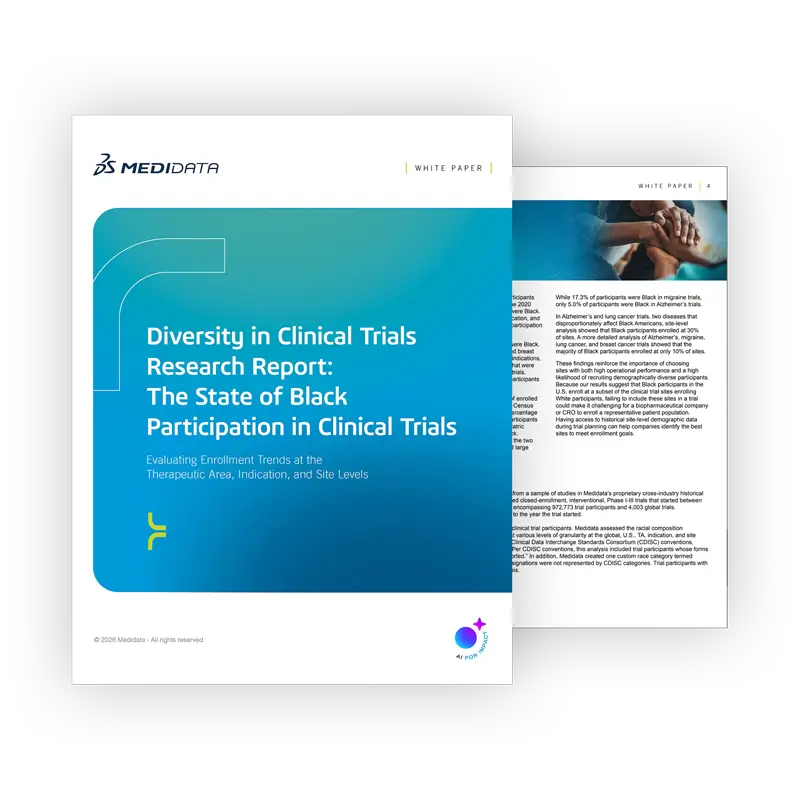 Medidata’s Diversity suite, part of the Medidata Patient Experience, is a curated suite of technologies, services, and insights purpose-built to help sponsors and sites recruit, engage and retain underrepresentated patient populations. By combining site-level demogrpahic data, real-time enrollment monitoring amd community engagement capabilities, Medidata empowers clinical teams to meet diversity goals and comply with regulatory guidance including the FDA’s Diversity Action Plans.