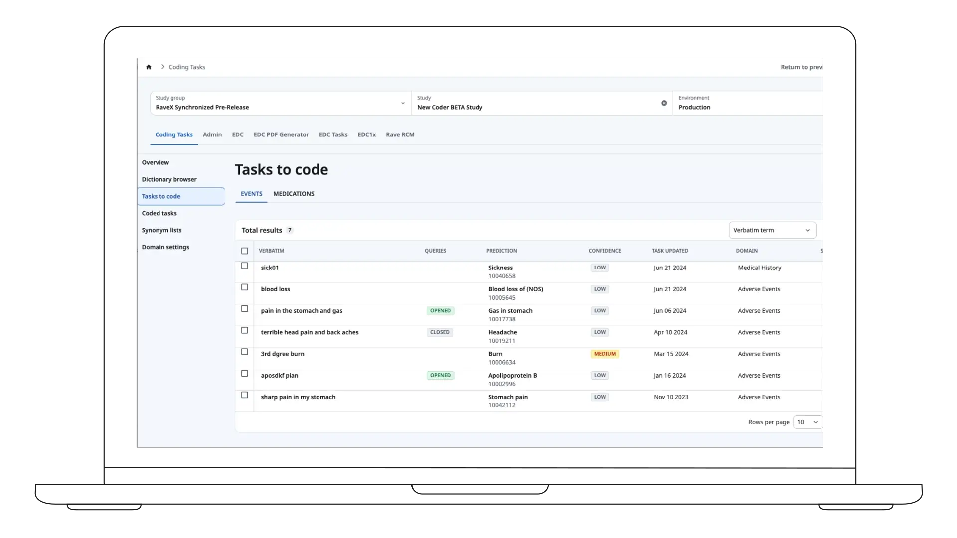 Medidata Coder+ applies AI-driven medical coding within Rave EDC, using models trained on over 90 million historic coding decisions to generate high-confidence predictions that improve speed and consistency across studies.