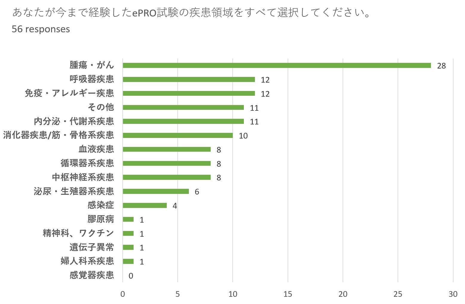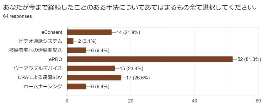 下記表は、DCTにおいて経験のある手段/手法について質問しています。ePROは多くのCRCさんがすでに経験されており、DCTにおいては代表的かつ市民権を得ているソリューションであり施設での浸透を実感する結果となりました。また、適用された疾患領域についても、幅広く利用が進んでいることが伺えます。