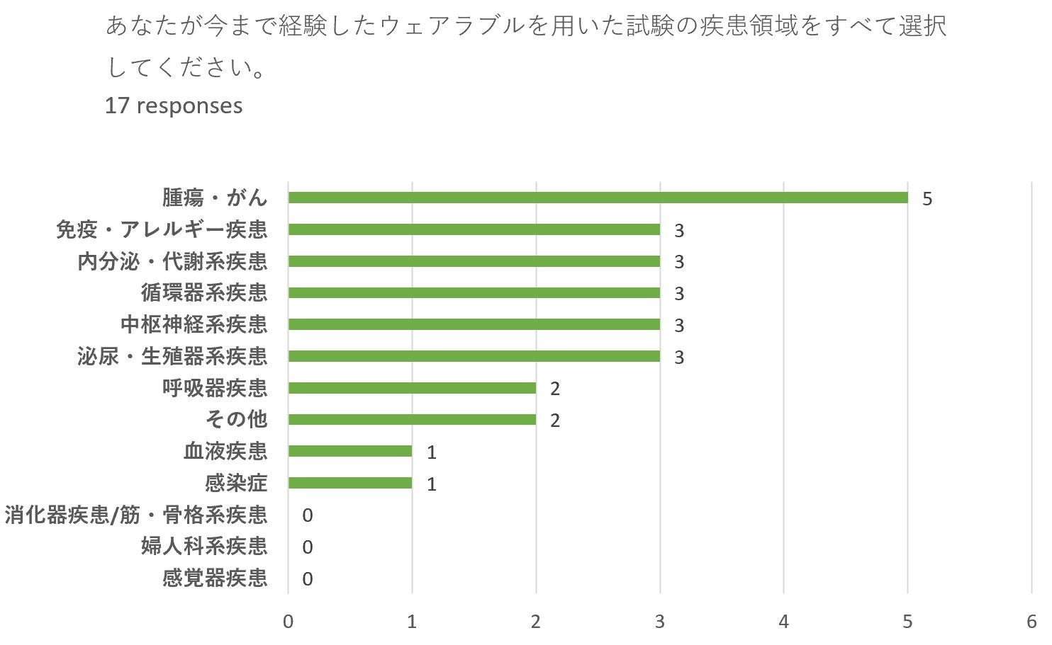 最後に、ウェアラブルデバイスの試験についても触れたいと思います。Medidataグローバル規模ではウェアラブルを用いた試験の実績が増えており、日本国内でもお問い合わせは増加傾向にあるものの、実際に適用された試験が少ないのが現状です。しかし、アンケートの結果では、約4分の1の16名の方が実際に経験していると回答しており、適用疾患領域も多岐にわたっており、興味深い結果となりました。